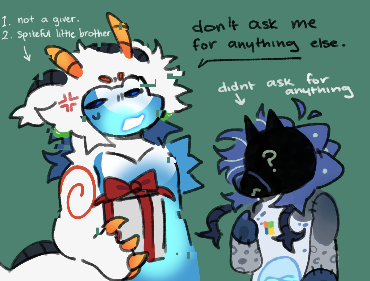 aero would much rather be getting a gift. vista doesn't like spending money on his brother, since he's always grumpy.