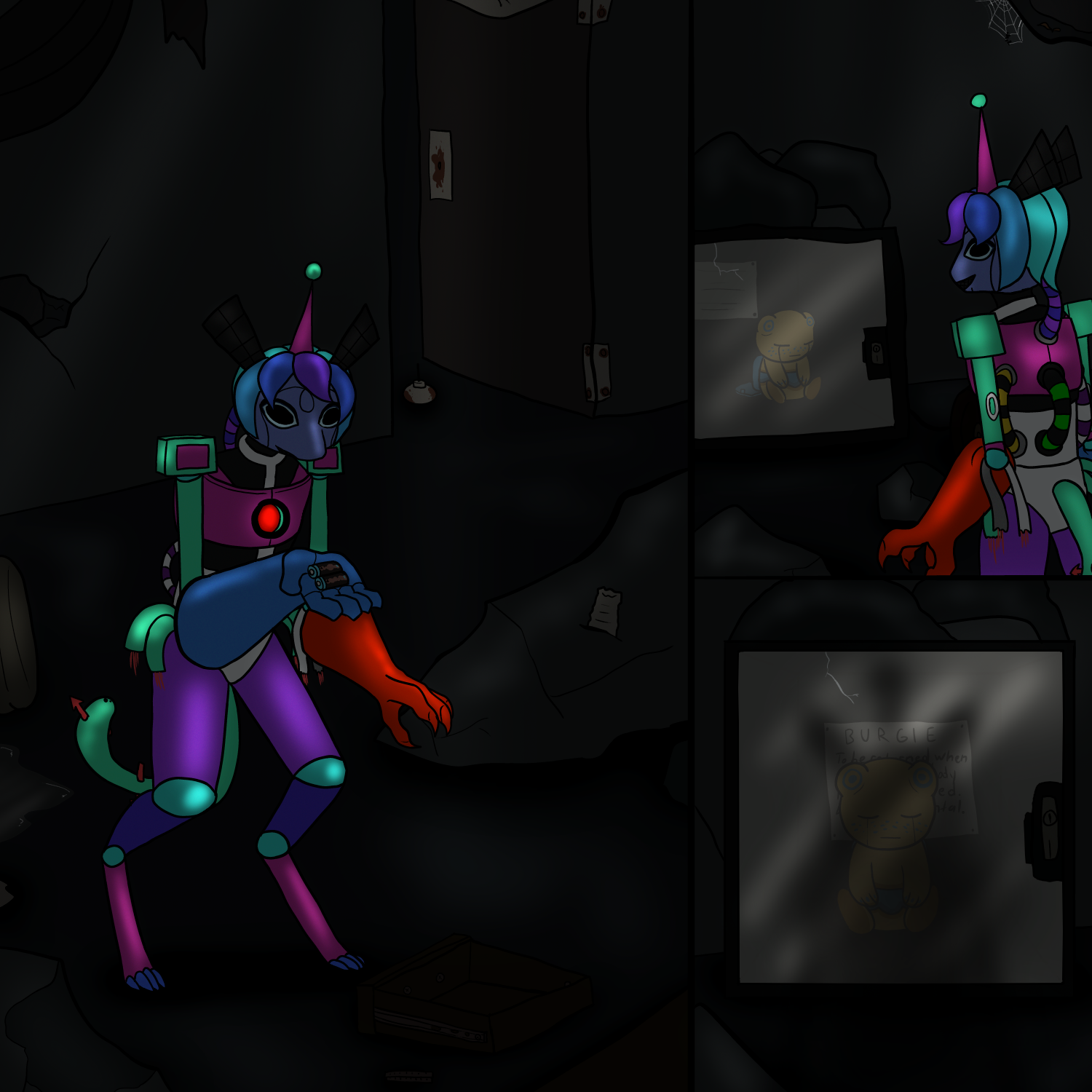 In a nearby office, the lock rusted off the door, I found what looked like a strongbox with a strange yellow creature inside. No, it was inorganic, just like me. I couldn't make out what was written on the plaque behind it behind the muddied glass, yet... from what I could see, it was a tiny toy, painted yellow and blue. ...What was this feeling stirring up in my processors the longer I looked at it? Like it was somehow familiar to me, though I did not know why...