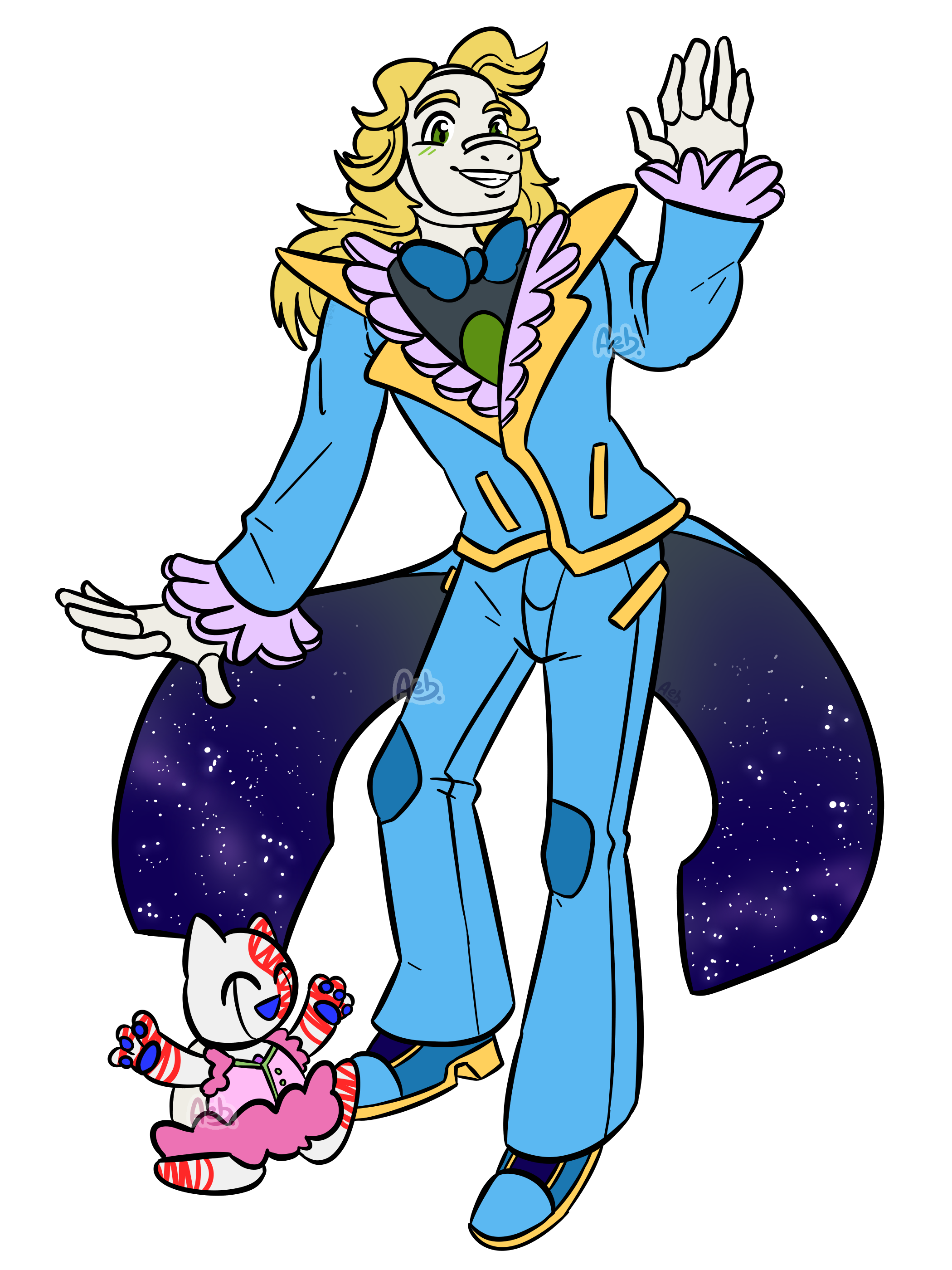 I've drawn my lad Adrian as a Magical Girl for the limited prompt!! I've also included his lil' bab Proto, all dressed up too! <3 This was really fun to draw and I decided to keep it as flat colors so I could admire the outfits more, ha ha! I really gotta draw these guys more, I love them bunches! Enjoy!