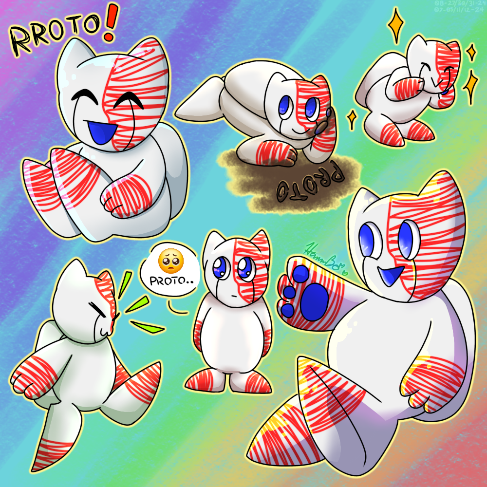 LOOK AT HIM, it's PROTO!!! O,//u//O,, This is so cute dude, AAAAH! You did an amazing job drawing my silly guy in so many fun poses, and I'm very very happy with how many times you wrote "Proto" on the canvas, considering that's the only word in his vocabulary right now, ha ha! I'm such a big fan of the rainbow background too, and of course your tasty shading and lighting techniques!! Thank you so much for drawing so many epic pictures of Proto!!! ^^ They're all so fitting!
