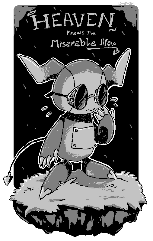 Prompt 5 is 'critter,' so I've gone ahead and drawn a crafted critter I have. XD That's it. I named him Crowlie ( ͡° ͜ʖ ͡°) so I drew him with some glasses and then I put "Heaven Knows I'm Miserable Now" above him 'cause I'm listening to that song by The Smiths. Quite a nice song to feel rather miserable to, you know? I also added a couple design elements to the words that mimic the Good Omens font on the book I have. :) I really like it all! Enjoy.