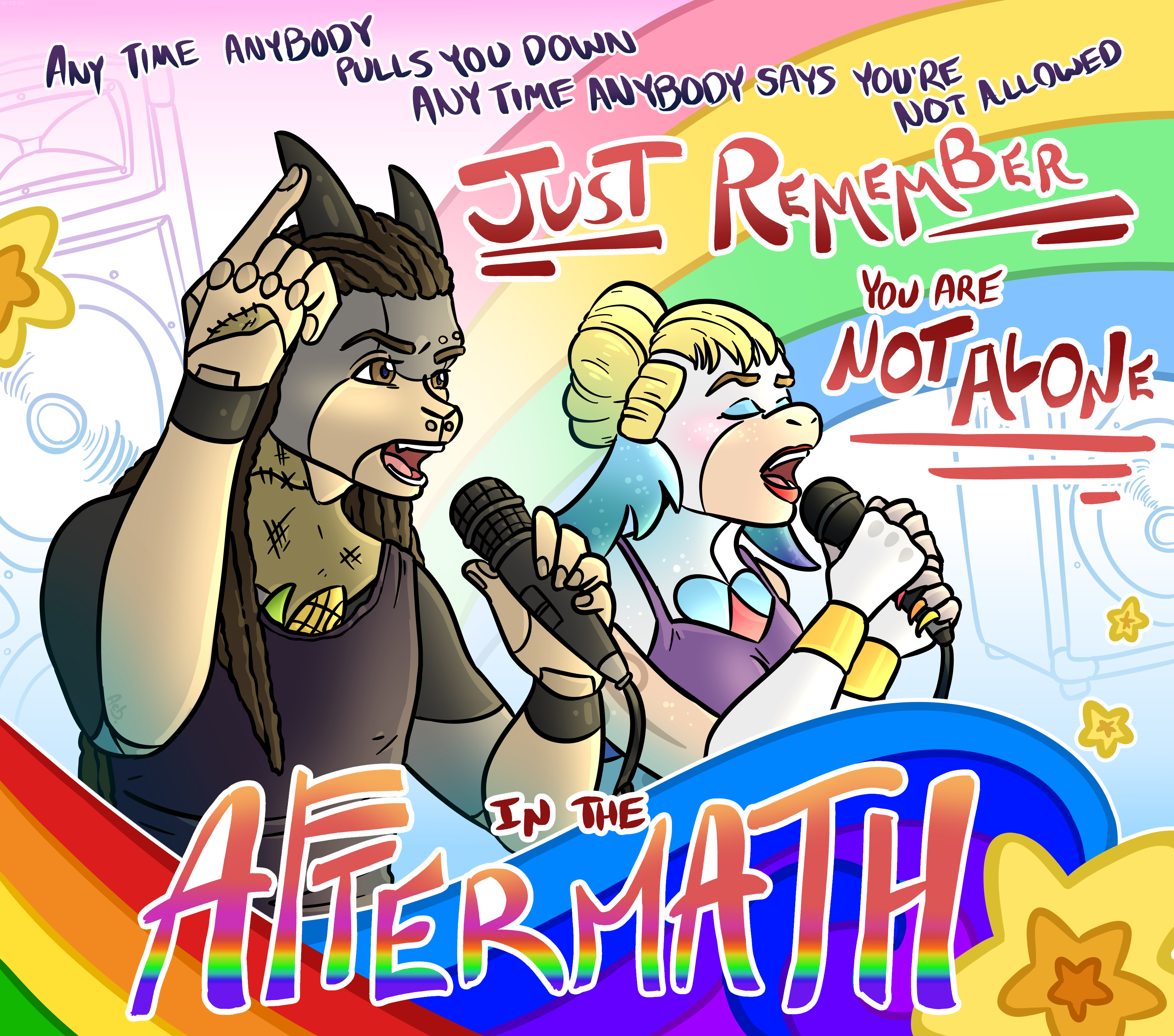 I'm not a really big fan of how this picture turned out, but Arch said I should upload it anyway, so here I aaaaam... :] It's for the Pride History flash prompt--and it's the Twisted Romantics singing Adam Lambert's song "Aftermath." :]] I looooove that song and it's extremely LGBT+ positive, and he also made a remix of it to raise charity funds for The Trevor Project! If you haven't listened to the song before, I'd highly recommend giving it a listen! (Though I haven't listened to the remix, just the album version!) Also, Korn's Jonathan Davis and Taylor Swift (inspirations for Jon and Tay) are very LGBT+ supportive too, so yay. :D Happy Pride times, sending love and digital hugs if you want 'em! ;) Enjoy!