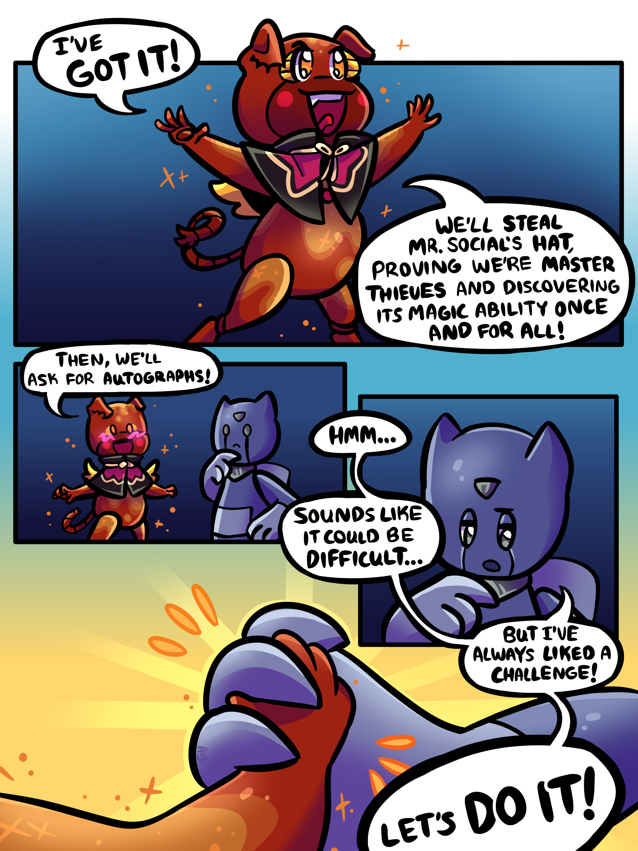 Back at it again with another page! Looks like Rahim and Gizmo are concocting a plan. Hopefully they don't bite off more than they can chew... Lettering this one was yet another struggle, but honestly, it's nice to just kind of let the words look like what they'll look like, so long as I've got the general appearance down. I think I've gotten to the point in my hand-lettering where I'm decently satisfied with it, and I'm using these pages as an experiment on how lax I can be with certain aspects of comic-making and still enjoy the result. Hmmmm, lots to think about. Enjoy!