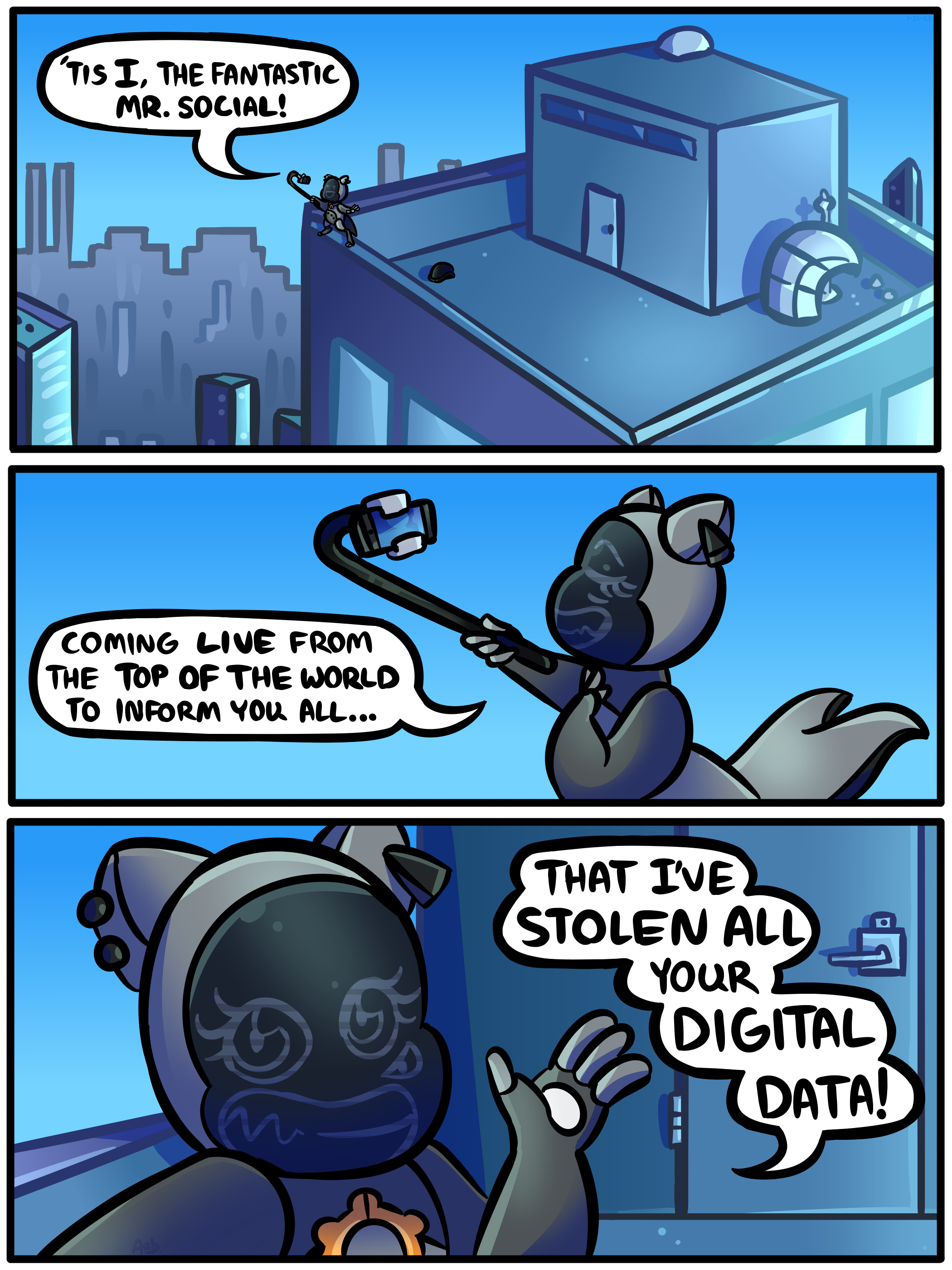 I was feeling motivated enough to do another page, yaaaay. :} Now Mr. Social makes his first appearance in the flesh (or metal,) teehee! Not so sure how I feel about the city's color scheme right now. It's very.... Blue. Also, I'm struggling a bit with the sizing of these bots. They're all nanos and robuddies, so they're gonna be itty bitty, but then there's already this huge city they're in, soooo... Oh weeell, it doesn't look horrible..... :( Enjoy.