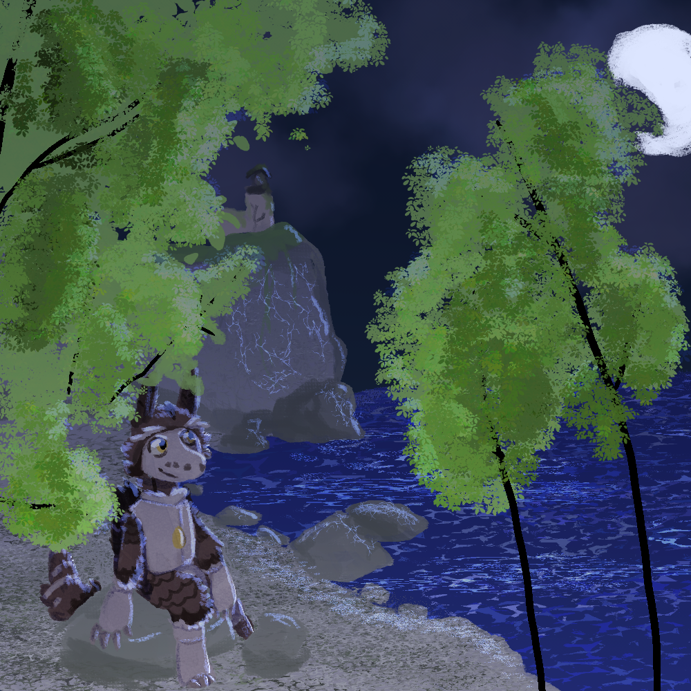 Hoots sat on the smooth cold rock, allowing himself to take in the salty air. The waves crashed gently into a nearby cliff as he admired the moonlight sparkle on the ocean. He streched his legs, his peg hitting a rock nearby. His wings streched out mechanically as he leaned foward, folding them to a close. His feet planted themselves into the cold rocky ground, little life around the actual ocean except the trees that provided shade. The sound of splashing and dipping caught him by surpirse, guiding his site into the sglistening blue. He laughed as a small group of fish seemed to be playing. His feathered eyebbrows fell to rest from their inital suprised. He touched the rock with his claws, allowing a piece to chip off and fall. It was peaceful out here. No sound except for the crashing of waves and occasional splashing of fish. Looking outwards to the cliff, an old lighthouse caught Hoot attention. It was covered in moss and mold, that filled the cracks. He questioned if the light still work. A sigh escaped him, a soft pause in thought as he just listened to the ocean. Many questions passed him by as he wondered what out there. Who is out there. Where does the ocean lead? Eventually Hoots got up and started heading toward the lighthouse, in hopes to check out the light.