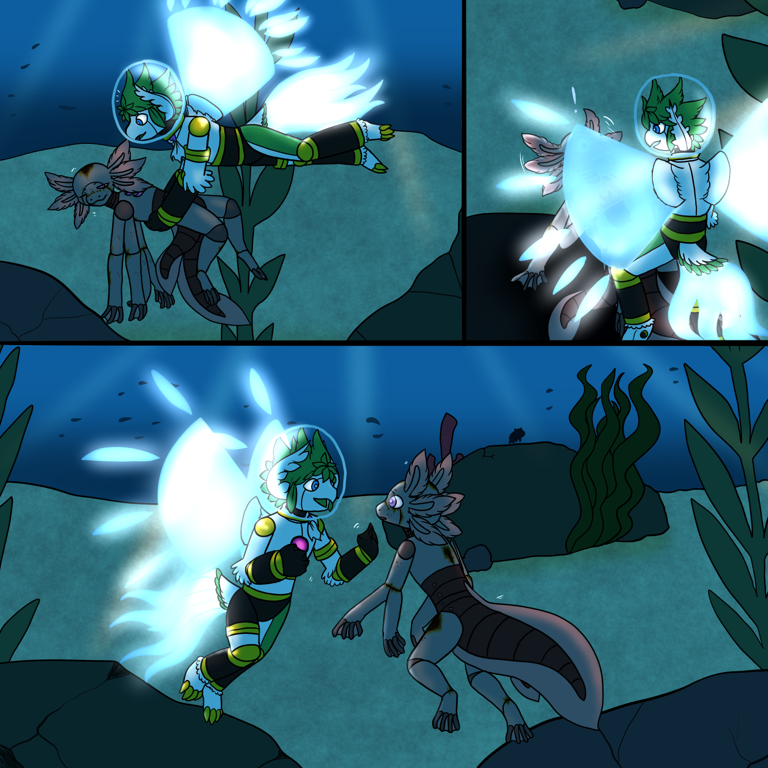 "Let's see... the trench is supposed to be this way, right?" Scraps idly mused to himself whilst carrying a rusted Amicabot through the ocean. Surely, a gigantic trench in the seafloor wasn't supposed to be this hard to find... but thanks to the earlier diversion via a helpful Specimen, he'd gotten lost. It's hard to look for landmarks when you're several miles below the ocean, especially when it's your first time visiting it, after all! In the midst of trying to reorient himself, Scraps noticed something out of the corner of his eye. The Amicabot he'd been carrying, deactivated... seemed to be stirring, if the flick of the gills on its head and the subtle glow of its core was any indication. For just a moment, he paused in his undersea... flight to give them a chance to wake up completely. When they did, they let out a brief "yip!" in shock. "Oh, you're awake," Scraps addressed them in pleasant surprise. "I was almost worried you wouldn't come to when I found you back there!" The other Amicabot took a moment to try and find their words... squinting a bit from the glow of Scraps' wings. "You... you're a terrestrial Amica, yes? What are you doing all the way down here?"