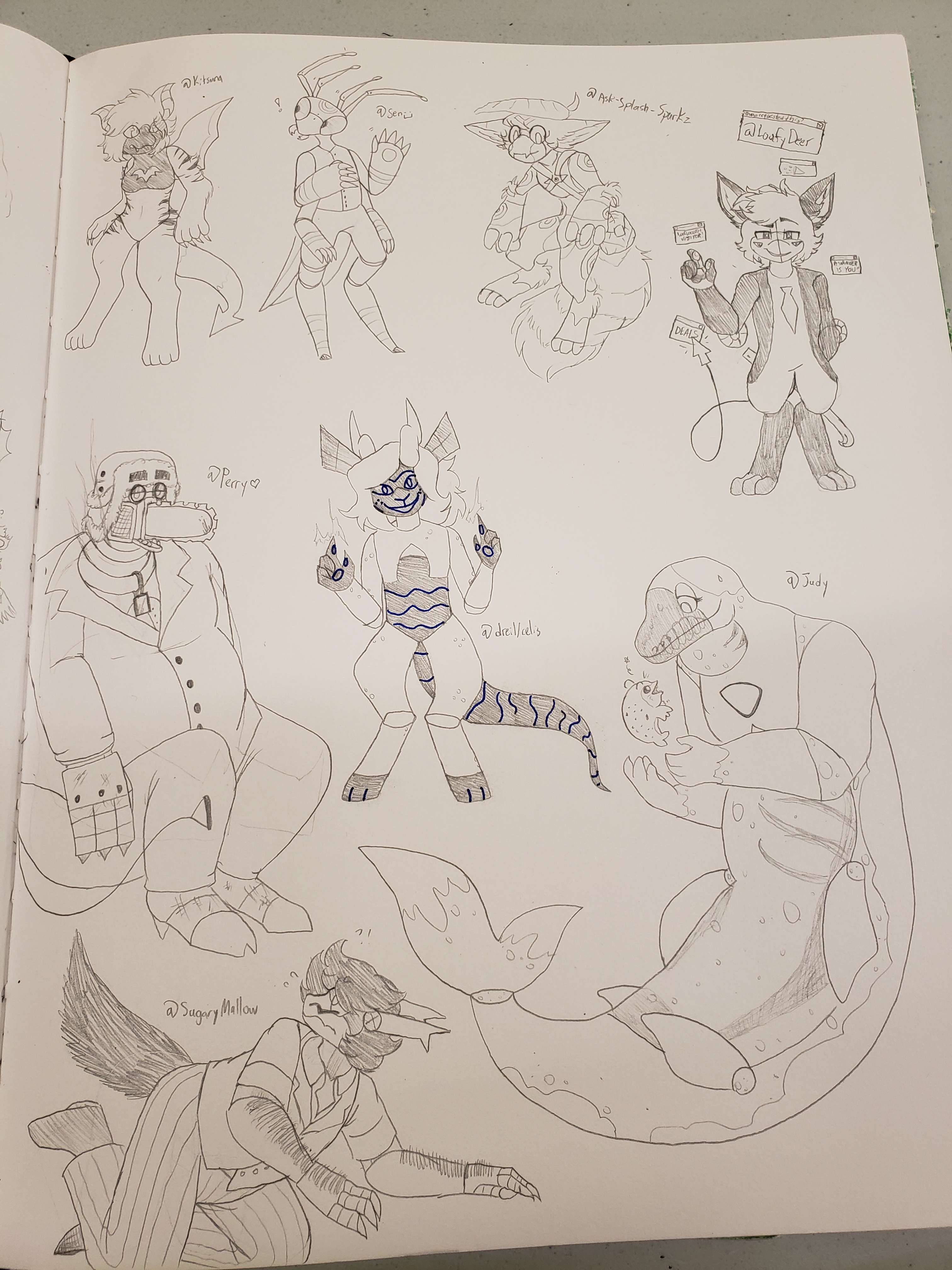 What better to do with a blank sketchbook page than fill it with gift art? Each bot was primarily sourced from the seeking gift art channel from the Discord. Thank you to everyone who provided me with one!